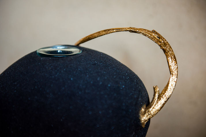 一切の装飾を拒むような、ざらついた黒。そして、ふいに現れるまばゆい光。ガラスの内側に施された金箔が、静かな器の奥から命を放つ。この作品は、型にとらわれない自然な形のままに、手を添えるようにしてつくられたもの。珊瑚と金箔、そしてサンドブラストという技法を通して、素材の“質”が語るものに、そっと耳を澄ませるようにして完成されました。